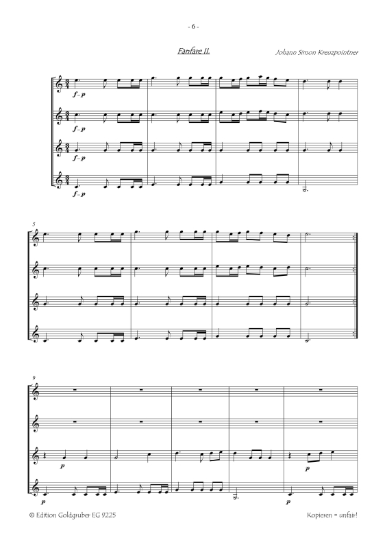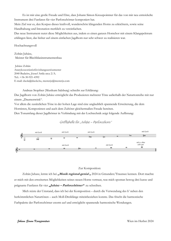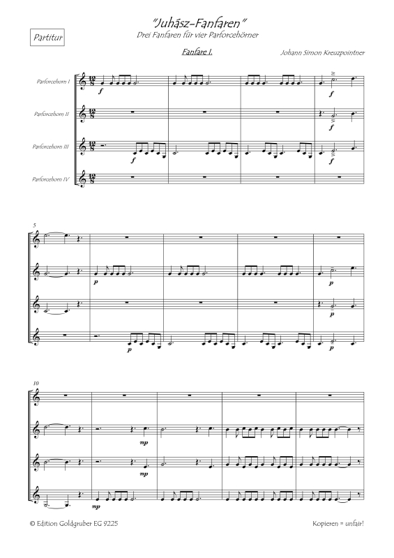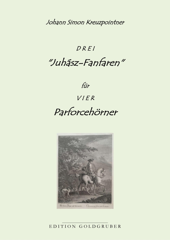 Johann Simon Kreuzpointner: „3 Juhász-Fanfaren“ für vier Parforcehörner1 Partitur A 4, 16 Seiten und 4 Stimmen á 4 Seiten A4